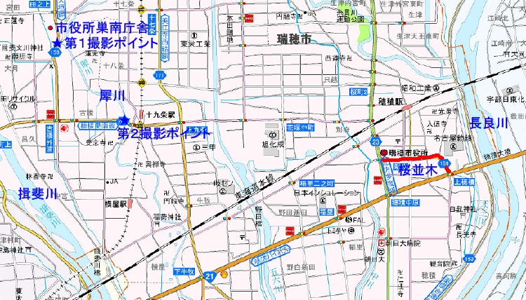 で、合併した結果、この瑞穂市は揖斐川と長良川という大きな2つの1級河川に挟まれるという形になりました。 その他、1級でない2級の河川も含めると、 糸貫川、犀川、五六川、中川、新堀川など、さして広くも無いエリアに、うじゃうじゃと川が流れていたりします。 で、この瑞穂市はですね、多くの河川が流れる環境を生かし、川沿いにソメイヨシノを植樹する「水と緑の回廊づくり」に3月から着手する。3年間で約2000本の桜を植える計画で、市は桜並木による都市景観の整備を図り、観光にもつなげていく考え。 (岐阜新聞より勝手に引用) …とのことでありまして、このプロジェクトはまだ始まったばかりなんですが、今現在でも結構あちこちに桜が咲いていて、なかなか綺麗だったりするんですよね。 例えば国道21号線を岐阜市から大垣市に向って走って、長良川の橋を渡った先、瑞穂市役所へ行くのに右手に入る道があるんですが、その辺り。見事な桜並木が続いております。 定額給付金を貰いにいくフリをして、市役所の駐車場にこっそりクルマを止めて散策してみるといいかも知れません。 もっともこの桜は車道の真ん中の分離帯に植わっていたような気がするので、歩いて愛でるにはやや不向きなような気もするんですけど。 花に気を取られてフラフラと車道にはみ出したところで暴走車に撥ねられて、櫻の樹の下には轢屍體が転がつてゐる!…という事態にもなりかねません。